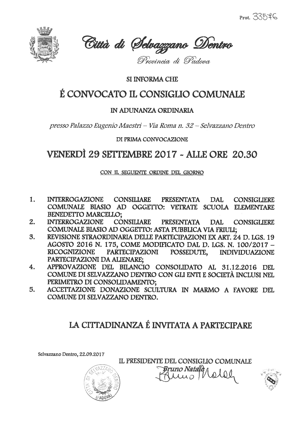Consiglio Comunale 29/09/2017