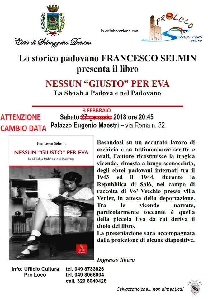 ATTENZIONE: PER IMPREVISTA INDISPONIBILITA' DELL'AUTORE FRANCESCO SELMIN, L'INCONTRO DI PRESENTAZIONE DEL LIBRO: NESSUN “GIUSTO” PER EVA LA SHOAH A PADOVA E NEL PADOVANO IN PROGRAMMA PER SABATO 3 FEBBRAIO ALLE ORE 20.45 A PALAZZO EUGENIO MAESTRI