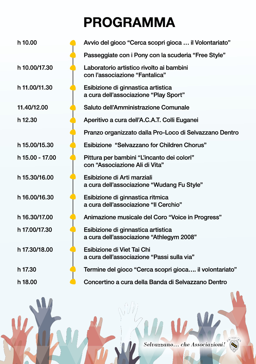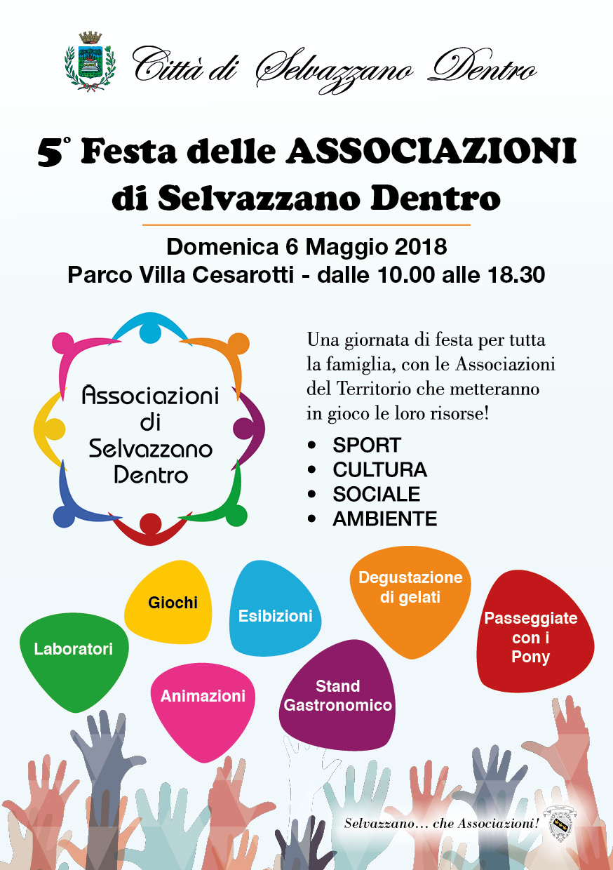 Nella bellissima cornice del Parco di Villa Cesarotti, le Associazioni di Selvazzano Dentro si presentano ai loro cittadini con giochi, esibizioni, stand gastronomico, laboratori, sport, musica ecc. Nell'arco di tutta la giornata per i più piccoli laboratorio d'arte, passeggiate con i pony e inoltre è attivo il "Giocone" per i bambini partecipanti con un gadget come premio finale.