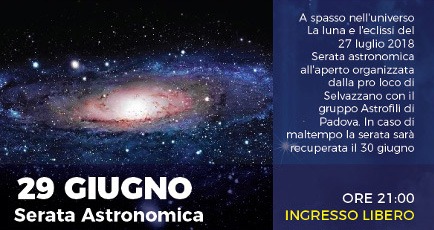 Venerdì 29 giugno 2018 alle ore 21.00 al Parco di Villa Cesarotti si terrà il secondo appuntamento di “Estate sotto le stelle 2018” con la serata astronomica estiva all’aperto organizzata dalla Pro Loco di Selvazzano con il Gruppo Astrofili di Padova A spasso nell'Universo - “La luna e l’eclisse del 27 luglio 2018”.